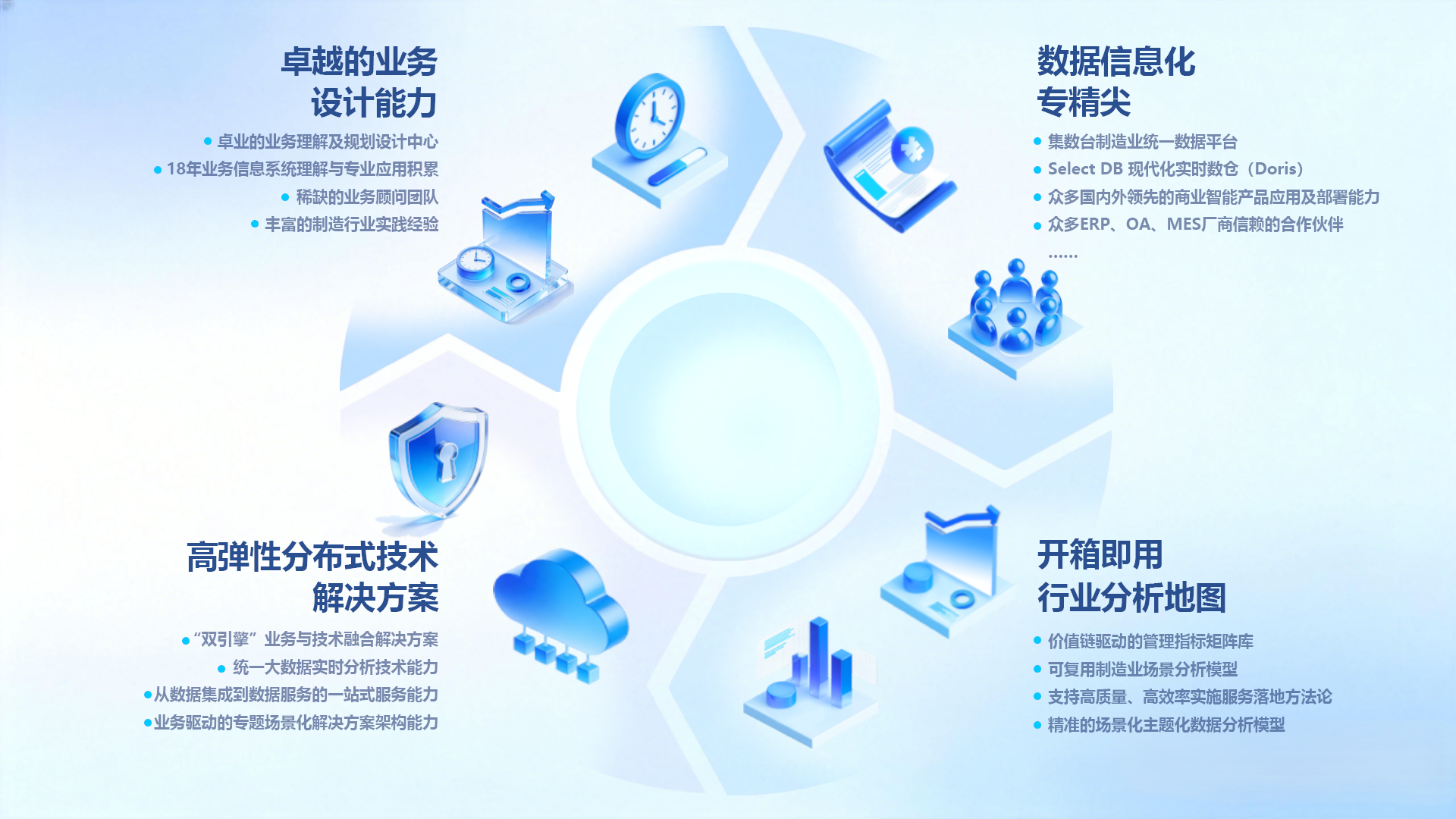 致力于应用数据技术服务制造业,为客户提供基于业务价值驱动的端到端数据信息化解决方案