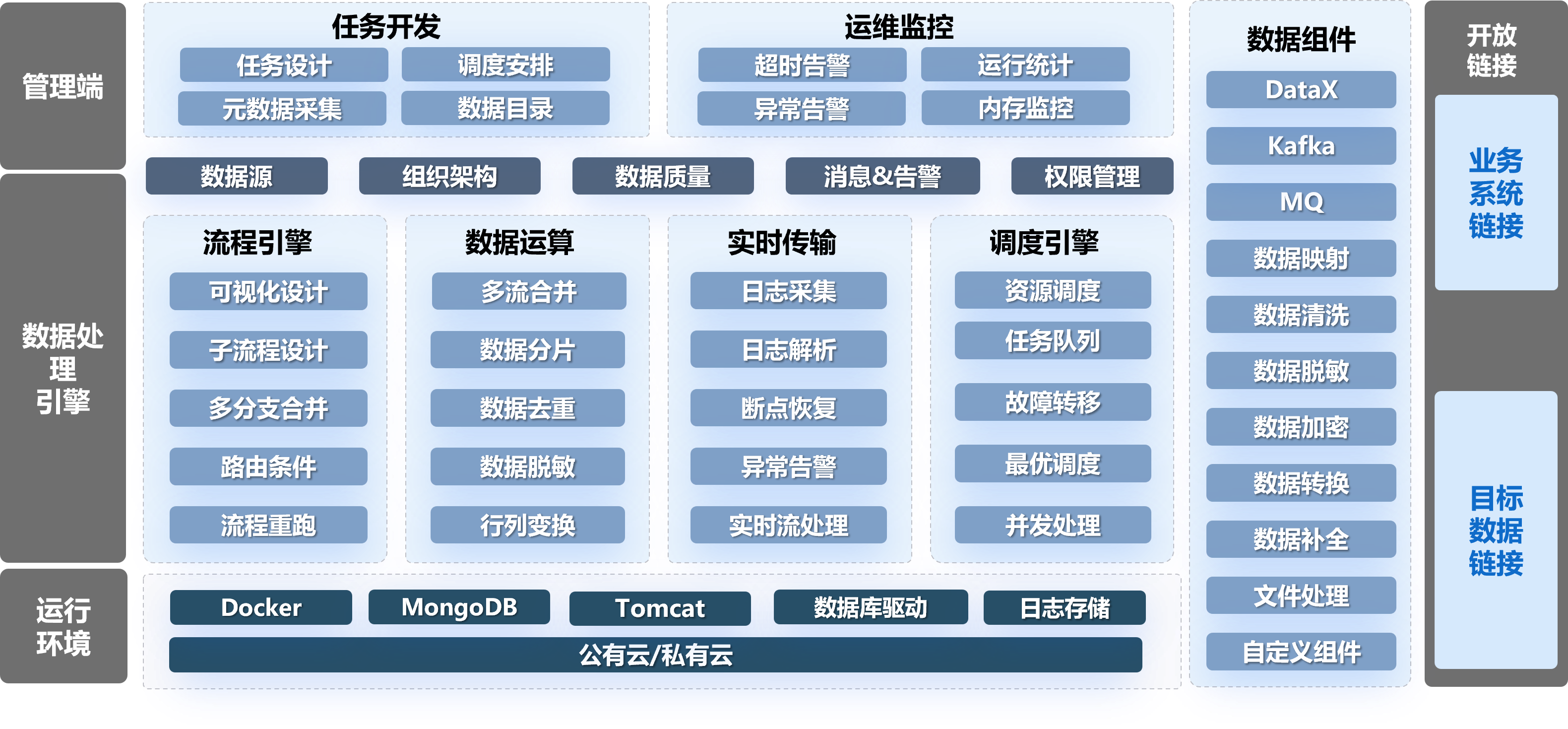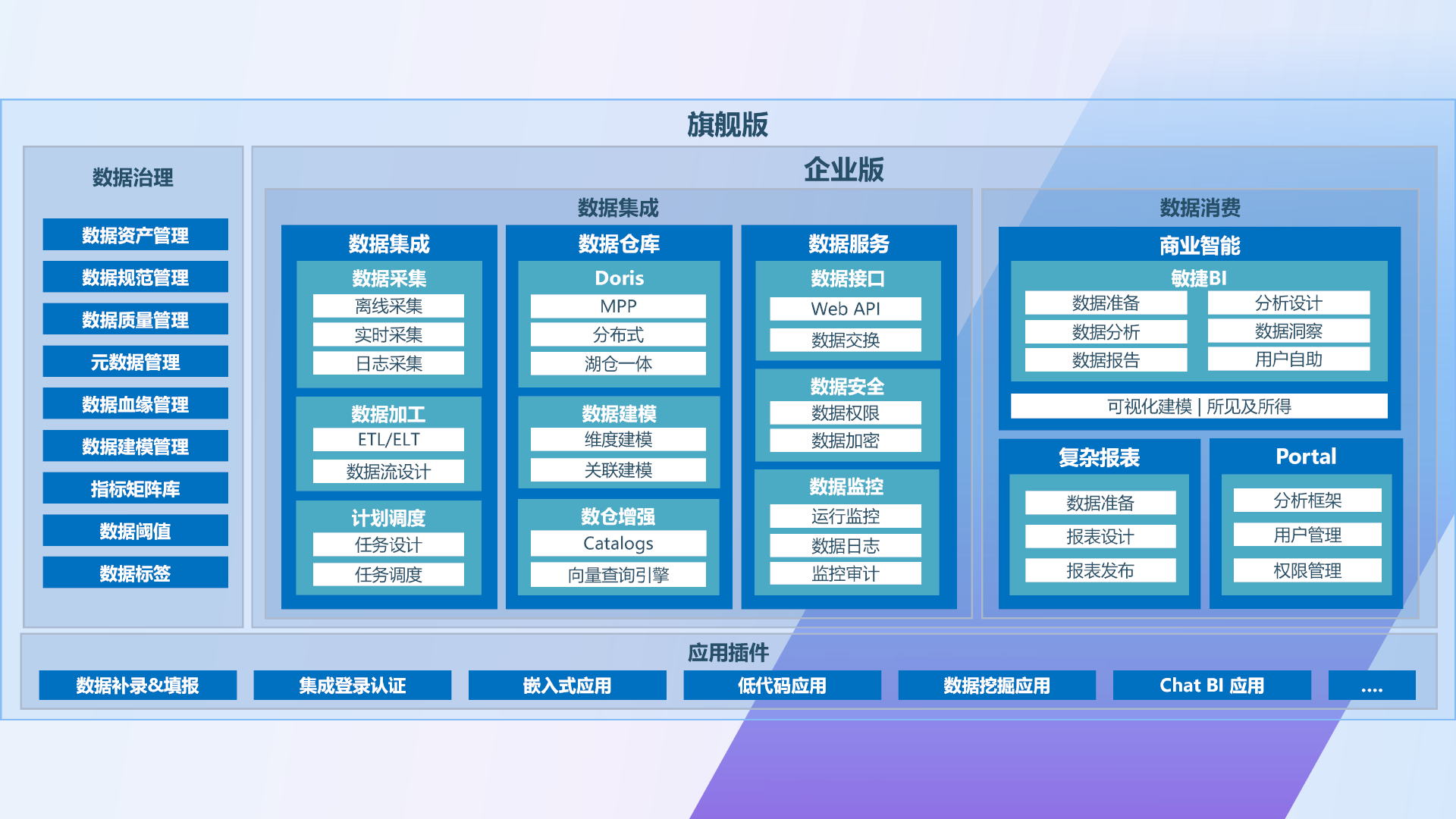 通过数据治理、数据安全管理模块,确保数据质量与合规性,降低风险,为业务应用提供可靠基础