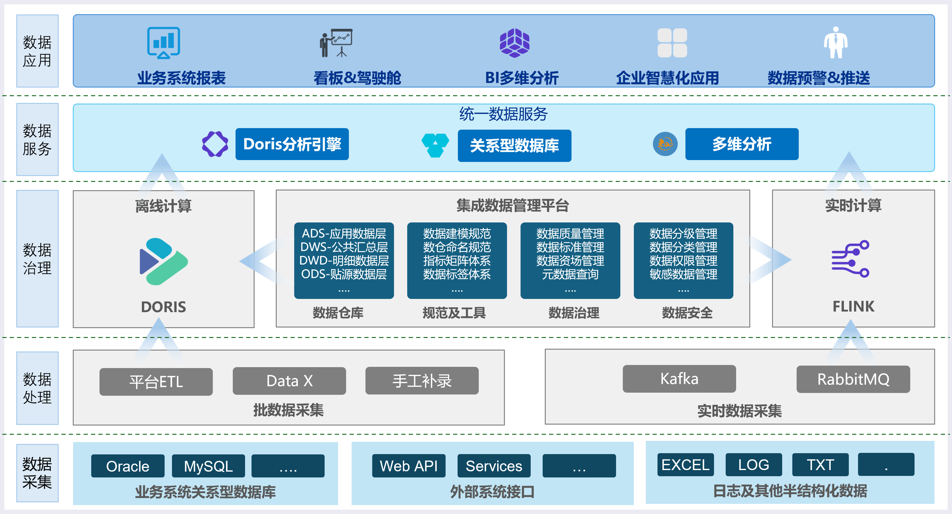 从底层的数据采集(结构化、半结构化、非结构化数据)、数据处理(离线ETL、实时计算)、数据分层存储(ODS、DW、ADS)到顶层的应用服务(商业智能分析、预警推送、智慧化应用)逐级递进,形成闭环的数据价值链